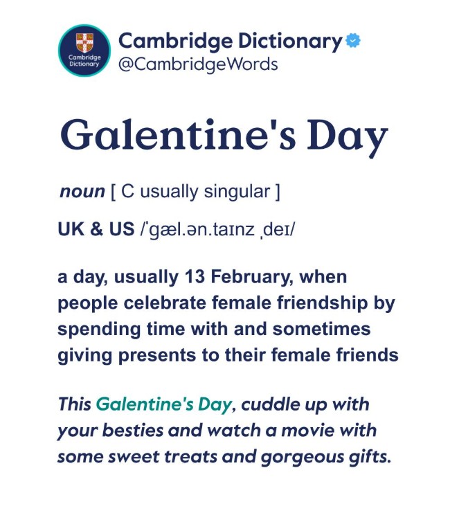 Gal(์ฌ์ฑ) + Valentine's Day๋ฅผ ๊ฒฐํฉํ ๋ง๋ก 2์ 13์ผ์ ์ฌ์ ์น๊ตฌ๋ค๋ผ๋ฆฌ ๋ชจ์ฌ ์ฐ์ ์ ์ถํํ๋ ๋ ์ด๋ผ๊ณ ํด์. ์ผ์๋ธ๋ฆฌ์ง ์ฌ์ ์๋ ๋ฑ์ฌ๋ ๋จ์ด๋๋๋ค. |